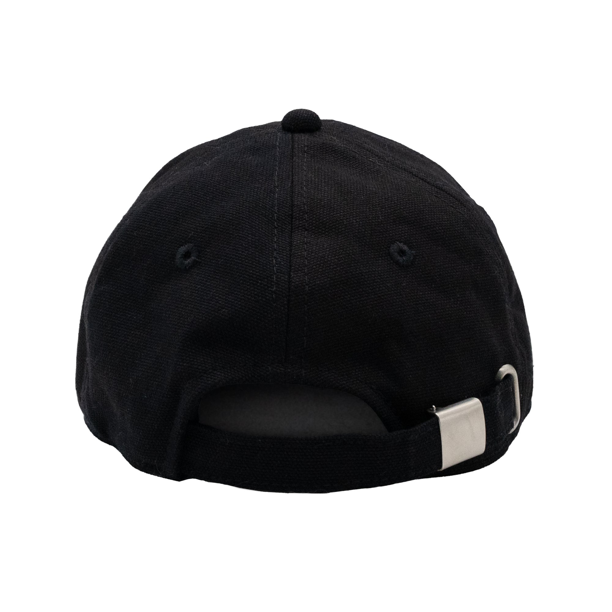 Embroidered onto a black low profile 6-panel unstructured canvas hat. Hat contains a silver buckle for the rear strap, an inner mesh lining, and an additional panel to cover the rear of the embroidery. A custom Kickback satin care label is also attached onto the inside of the sweatband.